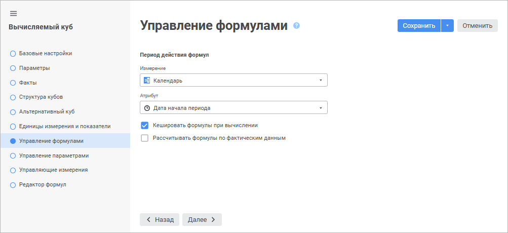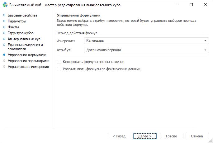 Кешировать формулы при вычислении. Установите флажок при необходимости кеширования формул при первом вычислении куба. Это позволит быстрее выполнять последующие пересчёты куба;