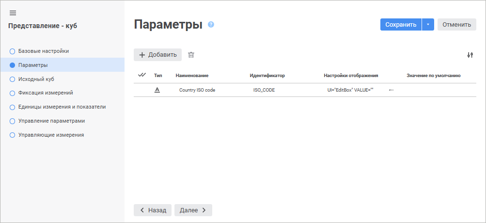 На странице «Параметры» задаётся список параметров объекта. Параметры позволяют формировать содержимое объекта динамически.