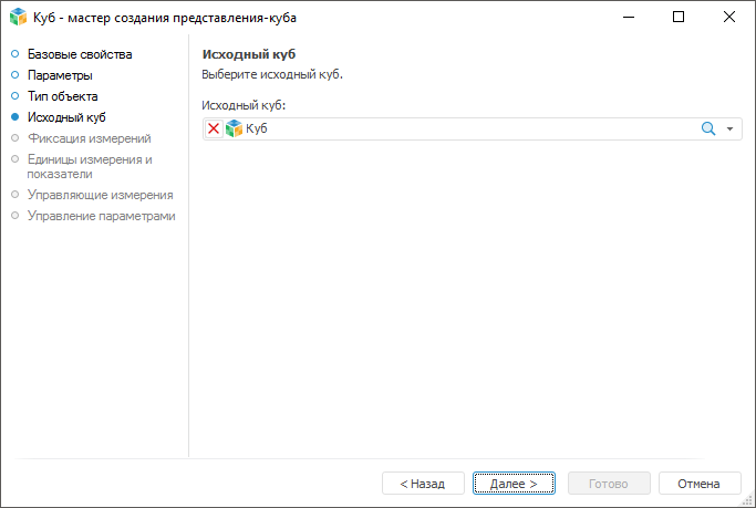 На странице «Исходный куб» выбирается куб, на основе которого будет построен представление-куб.