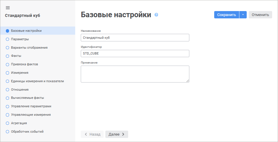 На странице «Базовые настройки» в веб-приложении и «Базовые свойства» в настольном приложении задаются наименование объекта, идентификатор и примечание.