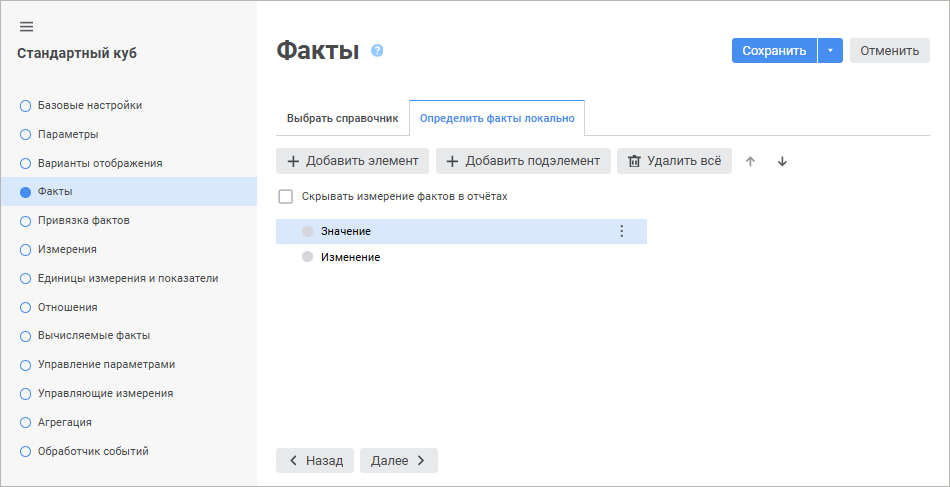 Для определения списка и иерархии фактов куба перейдите на страницу «Факты» мастера стандартного куба.