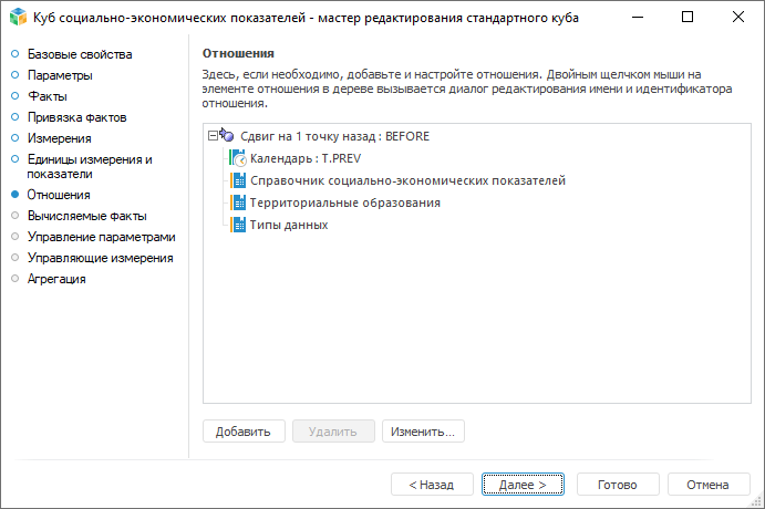 Отношения позволяют получать значения фактов путём смещения относительно текущей точки расчёта. Используются при формировании выражений вычисляемых фактов куба.