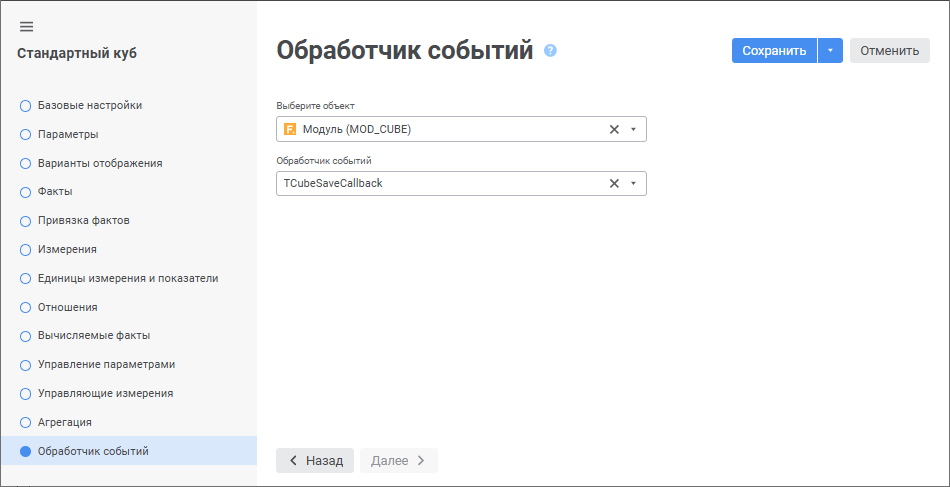 На странице «Обработчик событий» задаётся обработчик, позволяющий расширить функциональные возможности стандартных кубов.