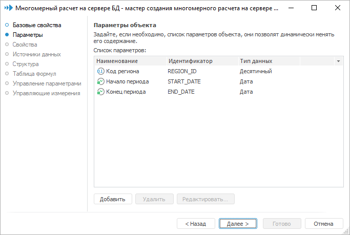 На странице «Параметры» задаётся список параметров объекта. Параметры позволяют формировать содержимое объекта динамически: