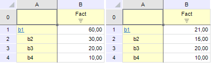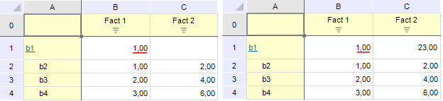 Результат применения формулы одинаков в обоих случаях (подчеркнуты красным): значение «b1(Факт1)» равно значению «b2(Факт1)». При использовании метода «Обновлять изменившиеся элементы непустыми значениями» (слева) значение для координаты b1 по Факт2 стало пустым, так как не было задано формулы по данному факту координаты; при использовании метода «Обновлять изменившиеся элементы непустыми значениями по показателям» (справа) изменение значения происходит только по тем фактам координаты, для которых была задана формула.