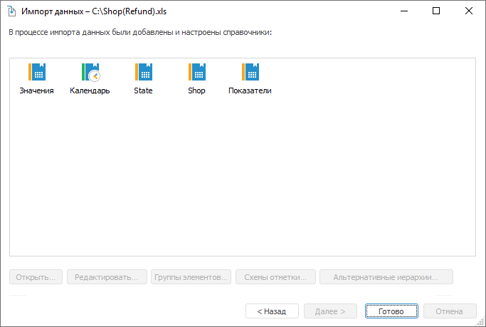 На последней странице мастера можно доработать справочники, используемые в структуре созданного куба. Можно создать группы элементов, схемы отметки или альтернативные иерархии. При нажатии кнопки «Готово» окно мастера импорта будет закрыто.