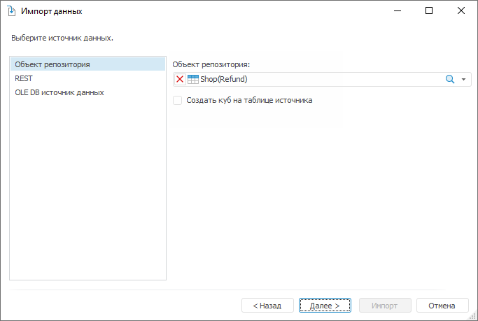 На странице «Выбор источника» осуществляется выбор источника данных. Внешний вид страницы зависит от типа источника, который был выбран на стартовой странице мастера импорта данных.