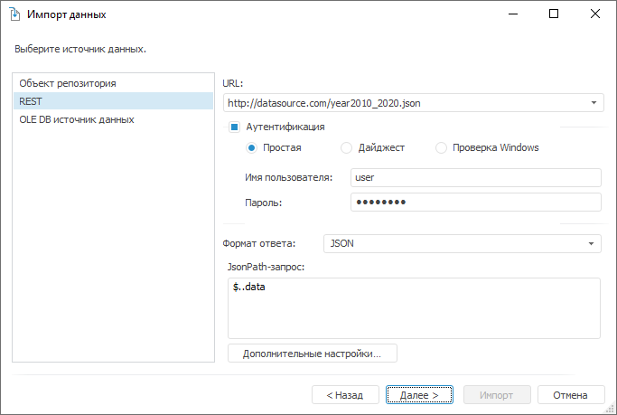В поле «URL» укажите адрес REST-сервиса, который предоставляет данные (в текущей реализации поддерживается подключение к REST-сервисам, предоставляющим данные в форматах JSON и XML). Если для подключения к REST-сервису требуется аутентификация пользователя, то установите флажок «Аутентификация» и выберите метод проверки пользователя. В полях «Имя пользователя» и «Пароль» укажите учетные данные пользователя. Указанные параметры будут переданы в ядро, обработаны необходимым образом и использованы при подключении к REST-сервису.