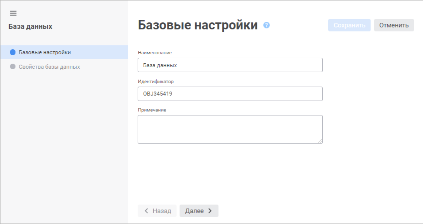 На странице «Базовые настройки» в веб-приложении и «Базовые свойства» в настольном приложении задаются наименование объекта, идентификатор и примечание.