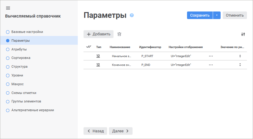 На странице «Параметры» задаётся список параметров объекта. Параметры позволяют формировать содержимое объекта динамически.