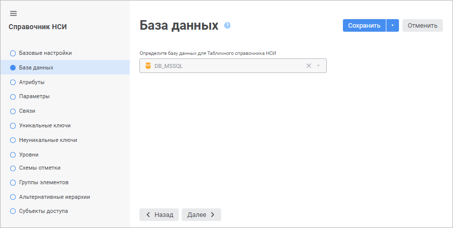 На странице «База данных» в веб-приложении и «Настройки» в настольном приложении выбирается база данных для хранения данных справочника НСИ.