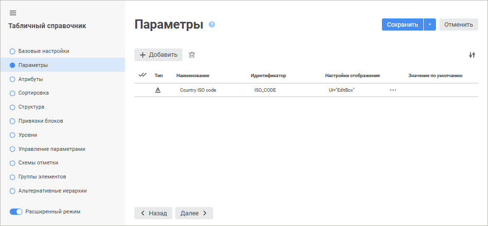 На странице «Параметры» задаётся список параметров объекта. Параметры позволяют формировать содержимое объекта динамически.