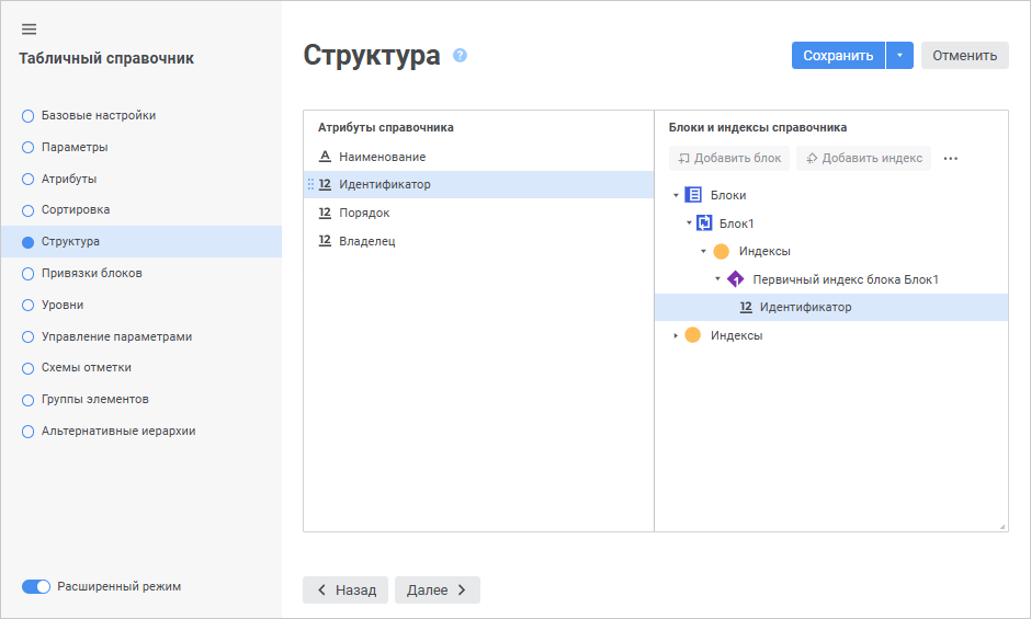 С помощью механизма перетаскивания Drag&Drop перетащите атрибут справочника «Идентификатор» из списка атрибутов справочника на элемент «Первичный индекс блока Блок1».