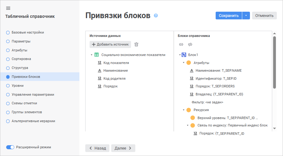 В списке объектов схемы выберите таблицу «Справочник социально-экономических показателей», поля которой необходимо привязать к атрибутам справочника. Свяжите поля с атрибутами следующим образом: