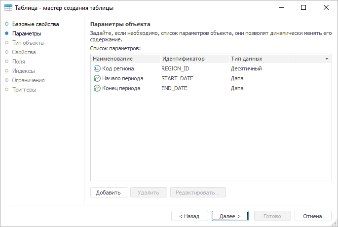 На странице «Параметры» задаётся список параметров объекта. Параметры позволяют формировать содержимое объекта динамически.