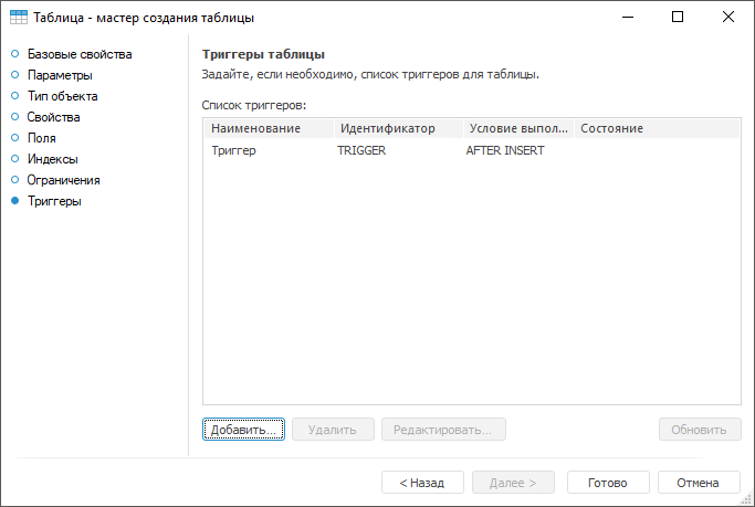На странице «Триггеры» задаётся список триггеров для таблицы. Если в веб-приложении выбрана база данных СУБД ClickHouse на странице «Свойства», то добавление триггеров недоступно.