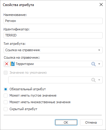 Примечание. В списке атрибутов отображаются только те атрибуты, для которых установлен тип «Ссылка на справочник» и снят флажок «Скрытый атрибут». Подробное описание настройки атрибута приведено в разделе «Свойства атрибута».