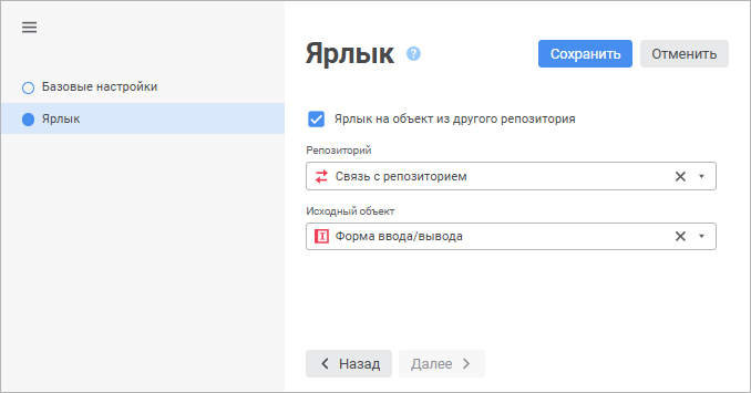 Ярлык на объект из другого репозитория. После установки данного флажка выберите объект «Связь с репозиторием» в поле «Репозиторий», который позволит получить доступ из текущего репозитория к объекту другого репозитория. После выберите объект в поле «Исходный объект».