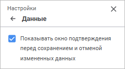 Установите флажок «Показывать окно подтверждения перед сохранением и отменой измененных данных» для отображение окна подтверждения. По умолчанию флажок снят.