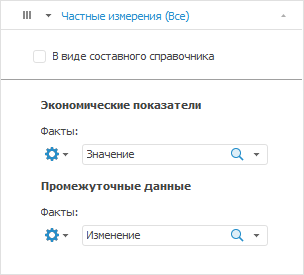 При перемещении измерения из общего в частные отметка во всех частных измерениях будет соответствовать отметке в общих измерениях, при перемещении измерения из частного в фиксированные будет отмечен только первый элемент.