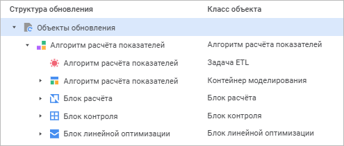 При добавлении в обновление алгоритма расчёта показателей дочерние объекты автоматически добавляются в обновление.
