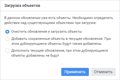 если в структуре обновления содержатся объекты, то при открытии готового обновления будет открыто окно «Загрузка объектов»: