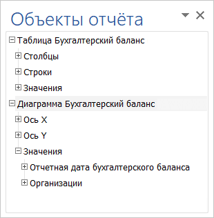 На панели «Объекты отчёта» название элемента, соответствующего диаграмме, по умолчанию формируется по следующему правилу: Диаграмма<Наименование источника данных>.