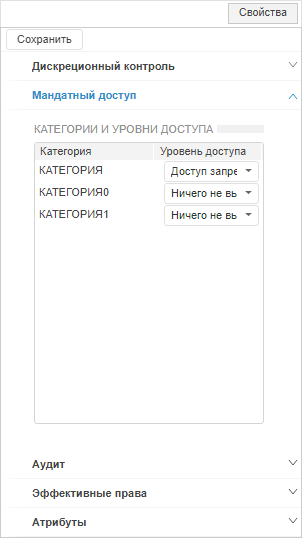 Для настройки параметров при мандатном доступе используйте вкладку «Мандатный доступ» на боковой панели «Свойства» в веб-приложении и в окне «Параметры управления доступом» в настольном приложении.
