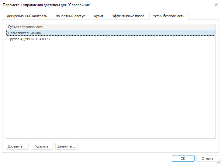 Для настройки меток безопасности используйте вкладку «Метки безопасности» в окне «Параметры управления доступом»: