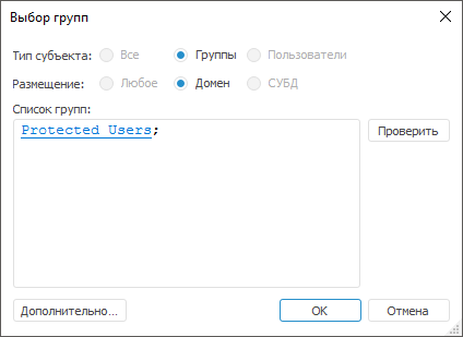 Для получения подробной информации о работе с диалогами выбора доменной группы пользователей обратитесь к разделу «Выбор пользователей и групп».