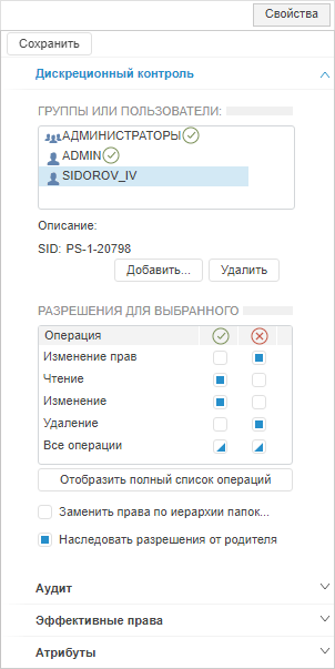 В поле «Группы или пользователи» отображается список субъектов безопасности, которые имеют право производить какие-либо действия над объектами. При выборе субъекта в настольном приложении в области «Разрешения» или «Разрешения для выбранного» в веб-приложении будет отражен список прав доступа по общим операциям (изменение прав, чтение, изменение, удаление), которые могут быть изменены для каждого субъекта безопасности в отдельности.