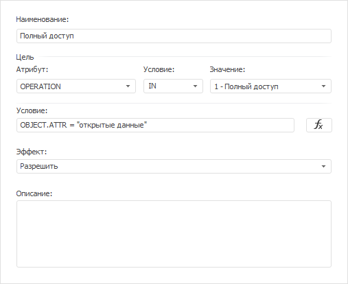Политика содержит правило, разрешающее полный доступ к объектам со значением «открытые данные» пользовательского атрибута «ATTR». Условие полного доступа задается с помощью атрибута среды окружения «OPERATION».