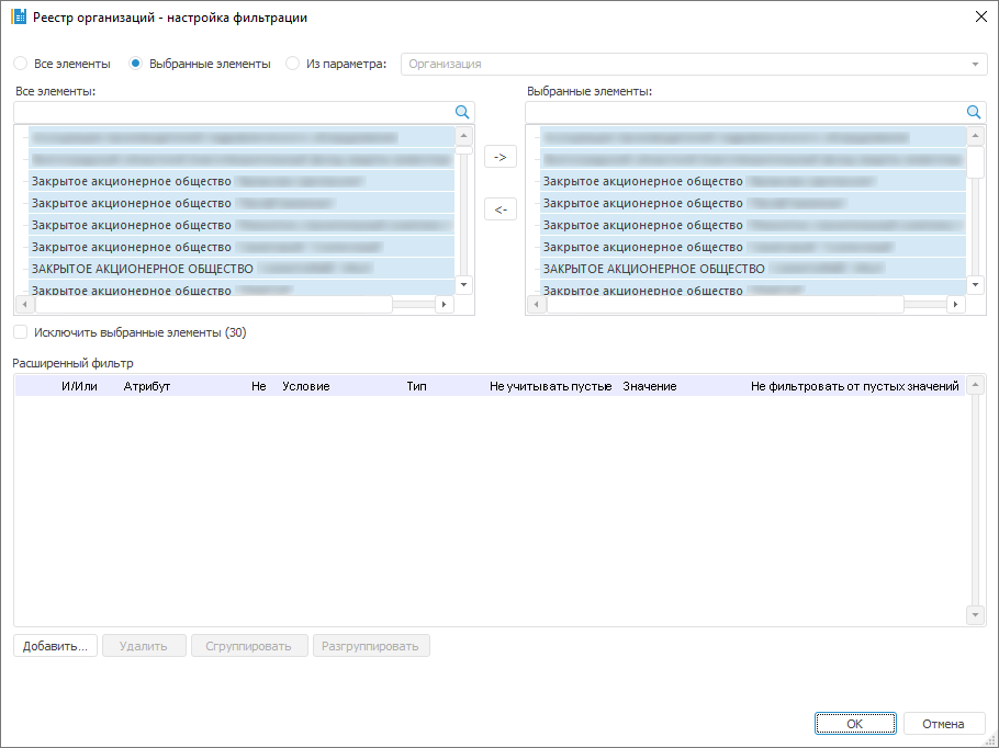 Фильтрация будет производиться по всем элементам, содержащимся в области «Выбранные элементы». При необходимости выполнения расчёта по всем элементам, кроме тех, которые содержатся в области «Выбранные элементы», установите флажок «Исключить выбранные элементы (N)», где N - количество выбранных элементов.