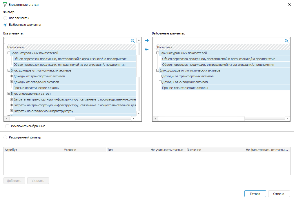 Примечание. Если в область «Выбранные элементы» были добавлены дочерние элементы без родительских, то родительские элементы также отображаются в области, но при этом не считаются выбранными и не участвуют в фильтрации.