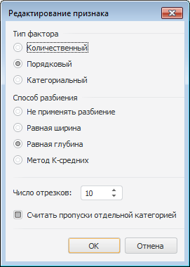 Для задания настроек редактирования признака или фактора, влияющего на анализируемый признак, используйте диалог «Редактирование признака»: