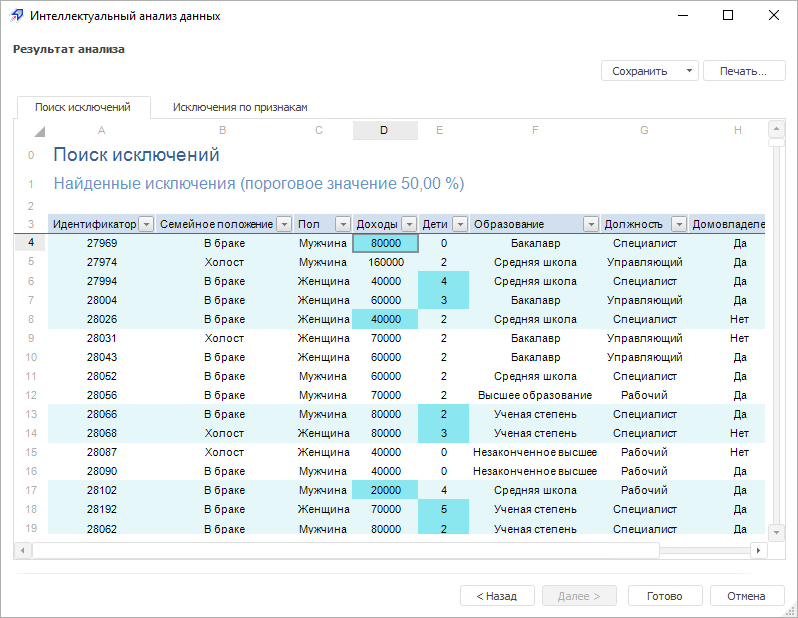 Пример результатов анализа «Поиск исключений»: