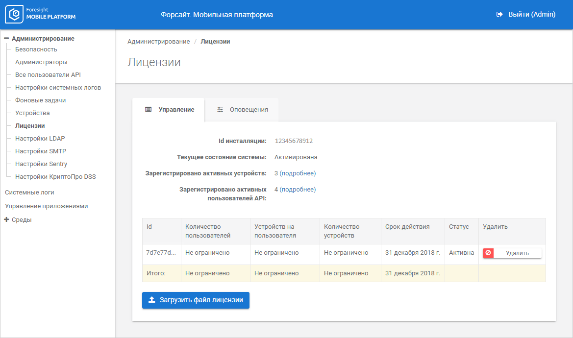 В рабочей области на вкладке «Управление» отображается Id инсталляции, текущее состояние системы, количество зарегистрированных активных устройств и пользователей API, список содержащихся лицензий с параметрами.