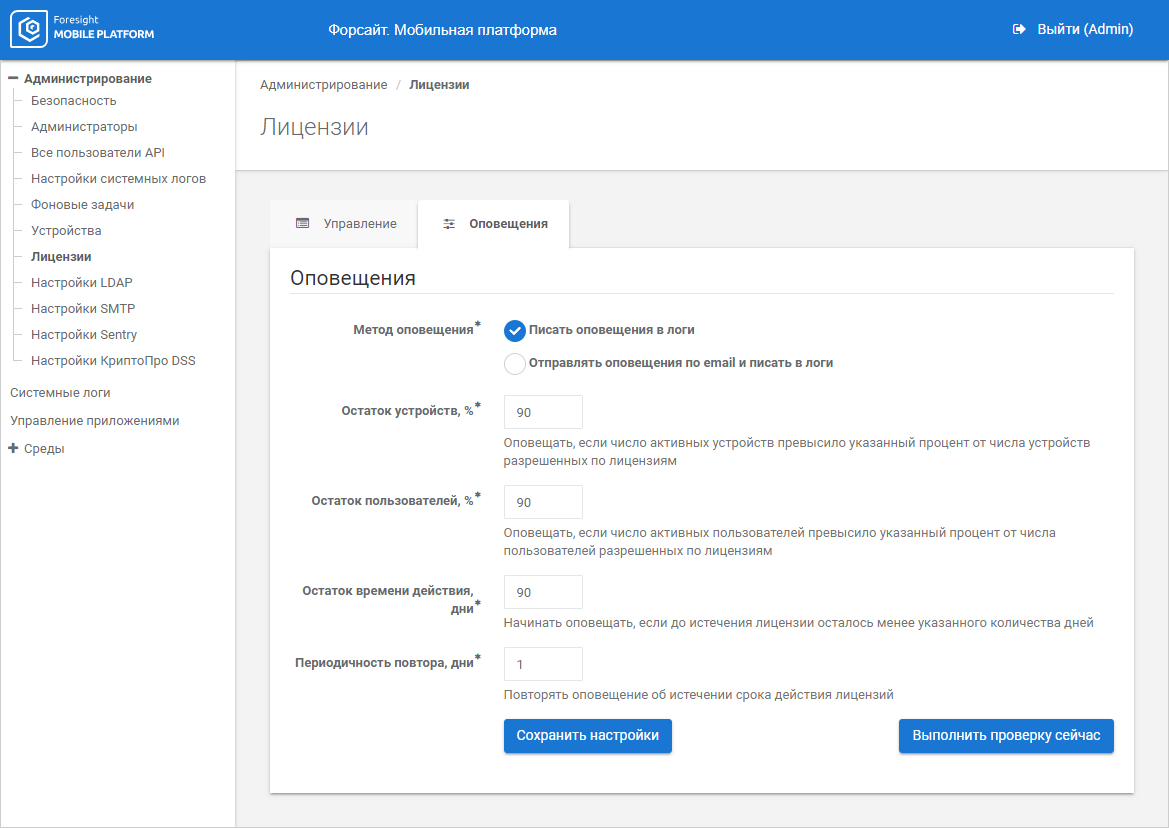 Для проверки работы отправки оповещений по еmail и записи в логи по заданным параметрам нажмите кнопку «Выполнить проверку сейчас».