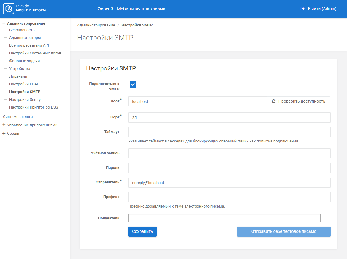 Нажмите кнопку «Сохранить» для сохранения параметров подключения к SMTP-серверу.