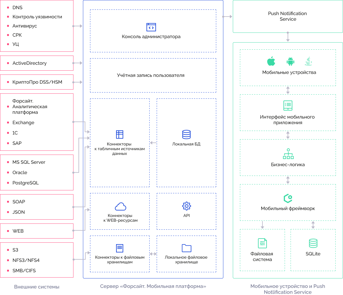 Функциональная архитектура программного продукта основана на подключении источников данных к серверу мобильной платформы и синхронизации с мобильными устройствами через Framework мобильного приложения.