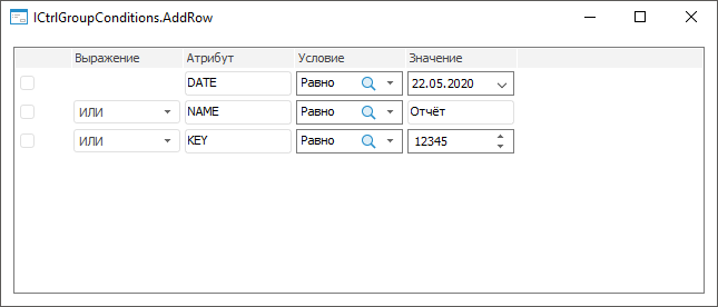 После выполнения примера в компоненте CtrlGroupConditions будут определены столбцы и добавлены три элемента с визуальными компонентами: