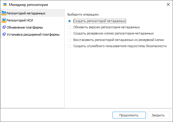 Вкладка «Репозиторий метаданных» содержит следующие операции: