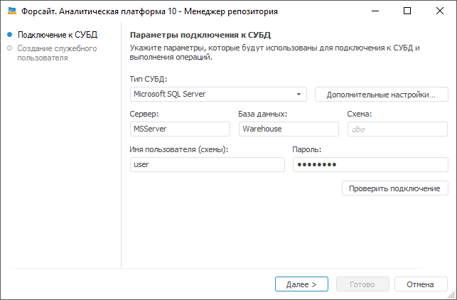 После выполнения действий будет открыта страница «Подключение к СУБД»: