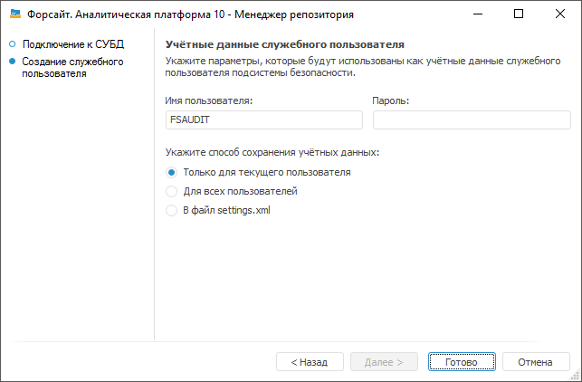 Только для текущего пользователя. Учётные данные будут храниться в ветке реестра текущего пользователя [HKEY_CURRENT_USER\SOFTWARE\Foresight\Foresight Analytics Platform\10.0\Audit\Credentials\Item0] и доступны для использования только текущему пользователю на компьютере;