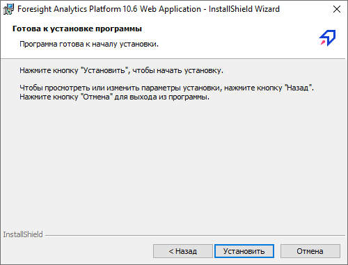 На следующем этапе мастер установки предложит папку, в которую будет установлено веб-приложение «Форсайт. Аналитическая платформа». По умолчанию предлагается папка «C:\Program Files (x86)\Foresight\» или «C:\Program Files\Foresight\» в зависимости от разрядности операционной системы. Для изменения папки нажмите кнопку «Изменить».