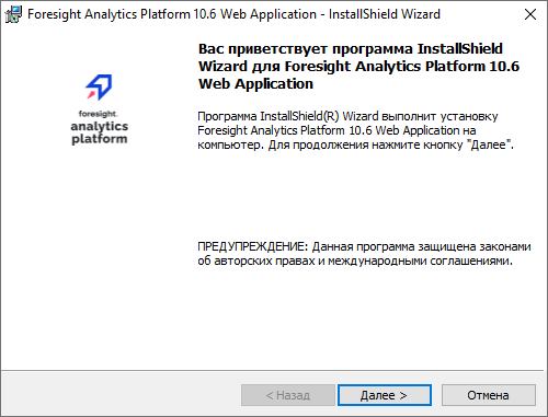 Для начала установки запустите файл FP10WebServer.exe. После запуска программа установки проверяет наличие более ранней сборки устанавливаемой версии продукта «Форсайт. Аналитическая платформа» и в случае обнаружения будет предложено обновление продукта «Форсайт. Аналитическая платформа».
