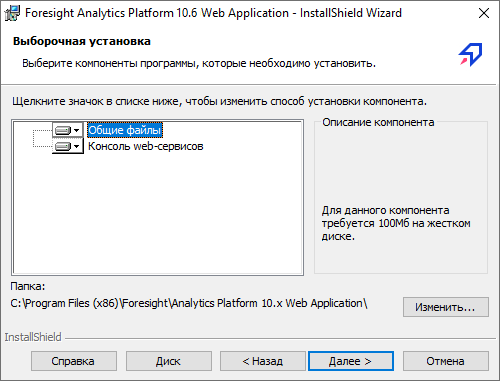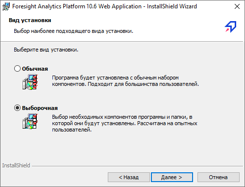 На следующей странице установите переключатель на необходимом типе установки. По умолчанию осуществляется обычная установка. Возможность выбора устанавливаемых компонентов, в том числе консоли веб-сервисов, будет доступна при выборочной установке.