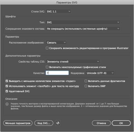 Сохраните изображение в формате *.svg со значением качества 7 в дополнительных параметрах SVG: