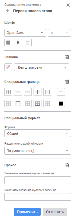 Элемент стиля. Доступны настройки: шрифт, заливка, специальная граница, специальный формат, прочее. После выполнения необходимых настроек нажмите кнопку «Применить».