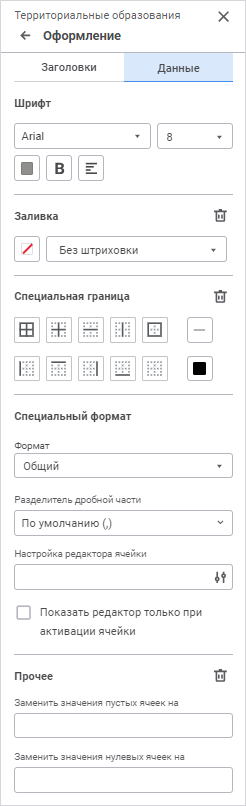 Данные. Доступны настройки: шрифт, заливка, специальная граница, прочее;